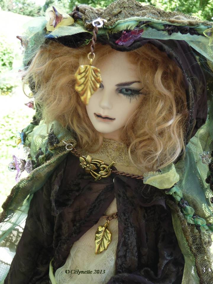 la cape avec capuchon, dans le pur style du manteau d'Heaven (Automne) sans les feuilles mortes au bas. j'ai juste coupé aux endroits pour bien dégager les feuilles et les rendre apparentes. La cape est réversible car doublée en organza vert/bleu pour des effets elfiques et comme ça en été il peut mettre le coté vert et en hiver le coté marron